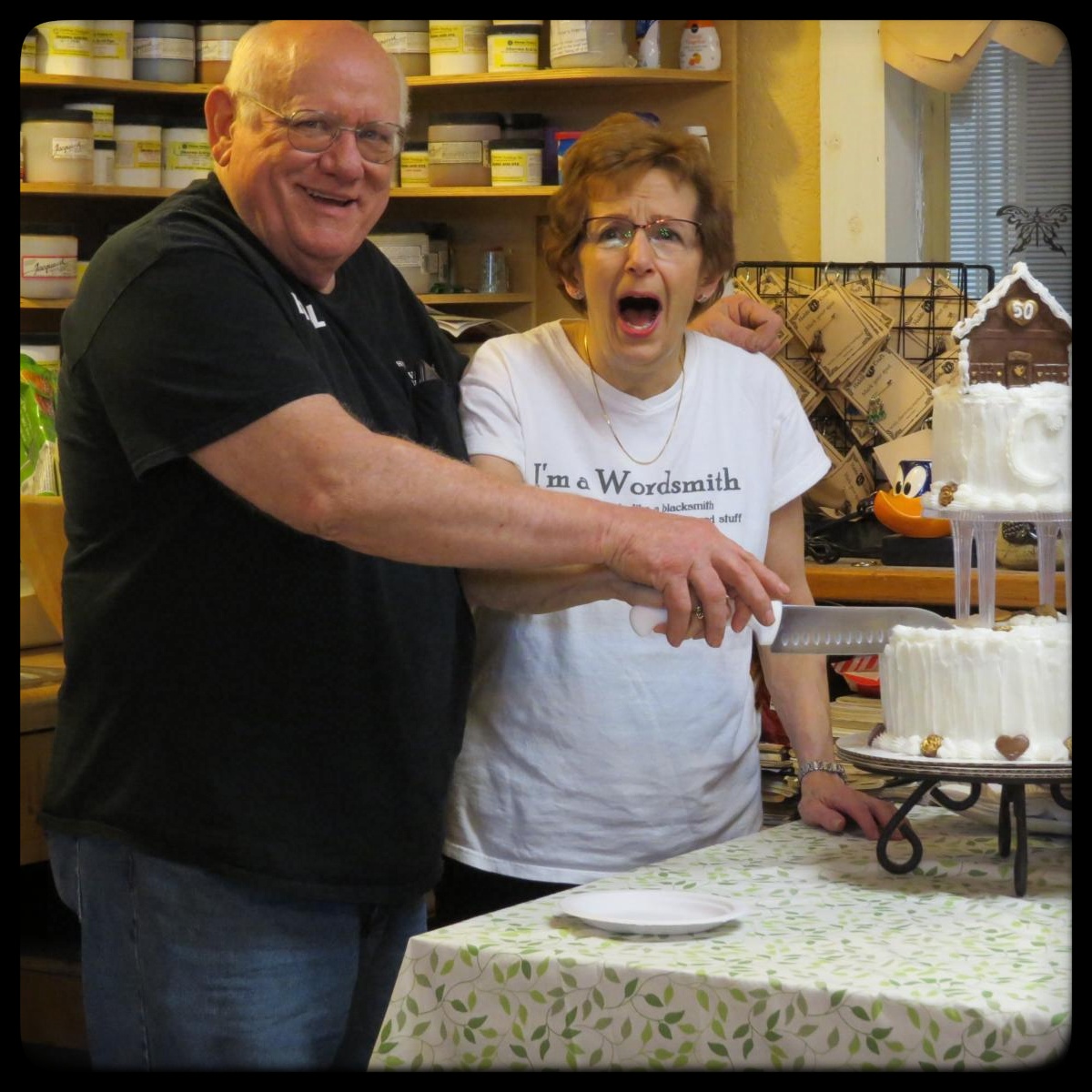 So here are a few photos of party prep, and Bill and Linda getting to the Crafts & Drafts and being surprised (and the cake). Good times, y’all. Good times!