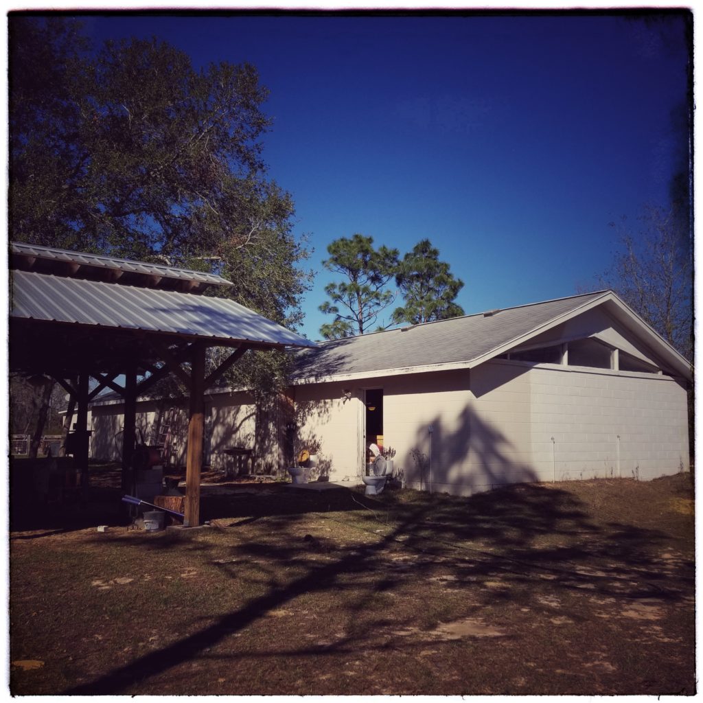 I’m still a day or two behind, but I’ll catch up over the weekend, here. (Wait, it is the weekend, right? What is today???). For March Meet the Maker Day 2, the prompt is “where”. Here’s where. 15 acres outside of Keystone Heights, Florida (between Gainesville and Jacksonville). The whole reason we bought the property is that big not-finished-being-painted building, my art studio. 2000 square feet, y’all! You can kind of see the house far off to the left, in back. In front on the left is our kiln shed; it holds a bunch of junk that shouldn’t be rained on, a wood-burning kiln, an electric raku kiln, and my blacksmithing equipment (gas forge, anvil, etc.). Inside the studio is where I do everything else – making ceramics, dyeing yarn, making soap…. everything.