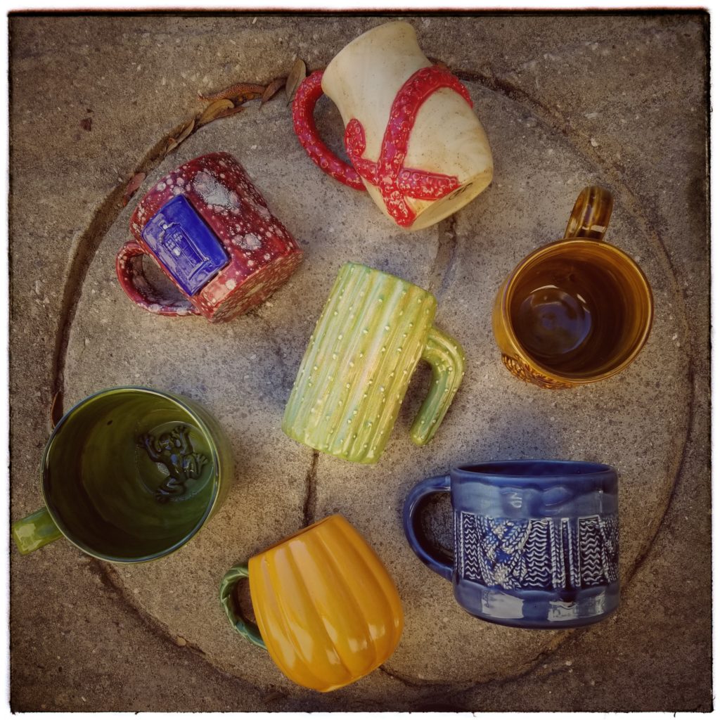 March Meet the Maker, Day 8: Flatlay. I admit I had to Google “Flatlay” — I didn’t know overhead shots had a name, I thought it was some sort of layout term for illustrators. Like a storyboard or something. Hahahaha, imma dork. Anyway. So. Flatlay! I have a love/hate relationship with those. They’re pretty, and enigmatic, but most of them look like they’re all photographed by the same person (at least in the bullet journal community, which is where I’m most familiar with the look). I can’t always do a Flatlay, either, with my stuff… see example photo! Mugs, when you’re trying to show them off rather than focusing on the coffee inside them, look pretty weird on their sides. Like Weebles that fell over. So I can use this look with some things I make (soap, yarn) but some of my ceramics just don’t stand well for it. Soap dishes do well (as I’ll show in my next picture today) but mugs, yarn bowls… all the nopes. And I can never photograph my desk like this for a bullet journal shot because there is always waaaaaaaaaaaay too much crap on my desk for that. Nobody needs to see that mess!