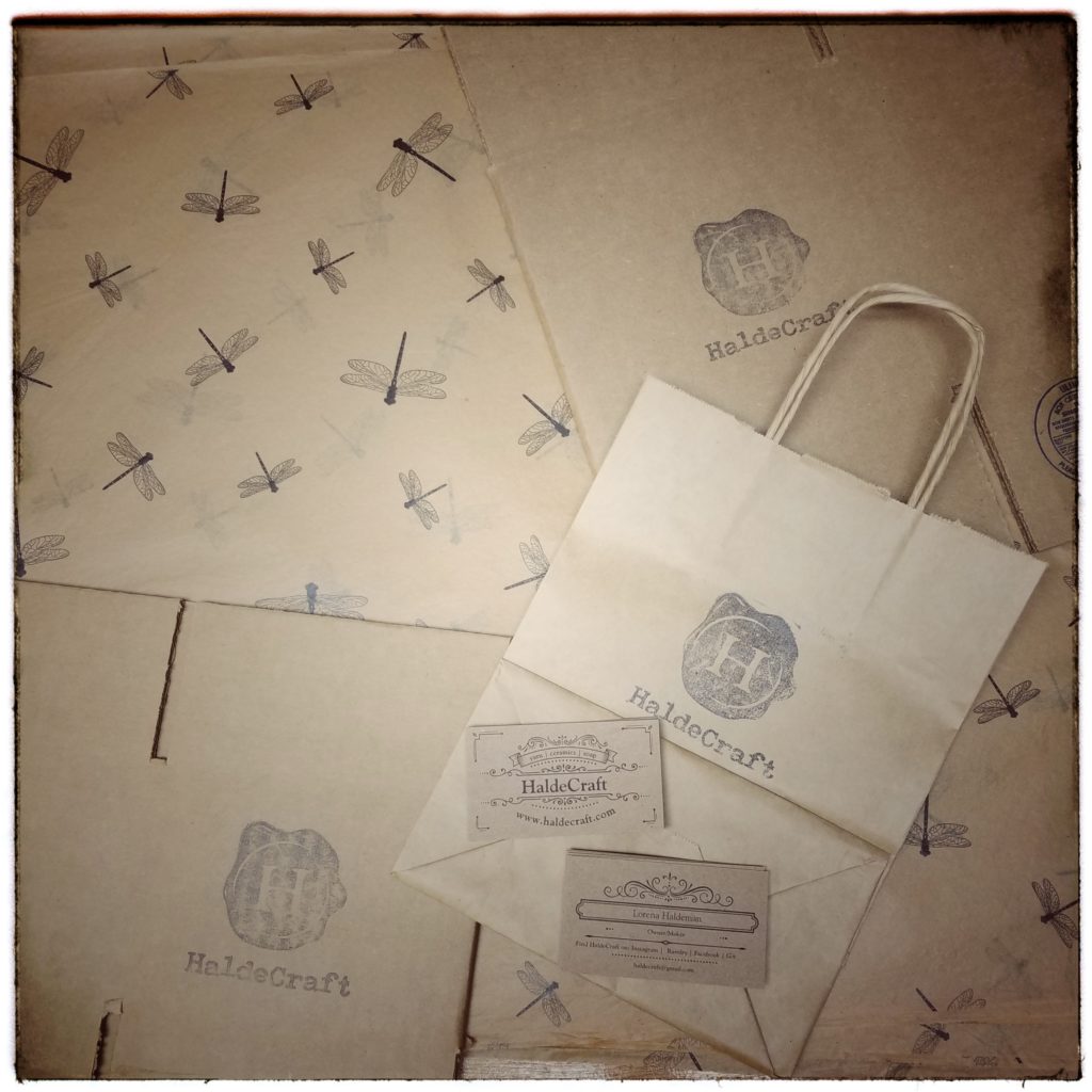 March Meet the Maker Day 11: Branding. My logo was designed by a friend and I have never thought of anything else. I may have changed the typeface I use on some things but the stamp/typewriter key with the “H” for my last name? Yeah. That never changes and I don’t see that it ever will. I put it on my bags for craft shows, my boxes for mailing, and I did forget to put it on these brand new business cards (derp!) but I’ll fix that with the next order (I just changed where I get my cards and I was a little overwhelmed by the differences). The dragonfly paper I found before I even opened, and I knew right away that’s what I wanted to wrap my goodies in. So I have physical markers of my brand that people, repeat customers, have come to know as mine. But there’s one thing that’s part of my brand that’s hard to communicate in physical objects, and that’s the personal touch and the sense of community I like to give repeat friendstomers (my word for customer/friends who have been with me for years). Like I said, that’s hard to put a physical marker on, but I try to do it every day in my blog posts, my Ravelry threads, my social media posts, and when I answer comments on all of those, or email. I always try to give a personal touch and make sure that whoever is talking knows that I’ve heard them.