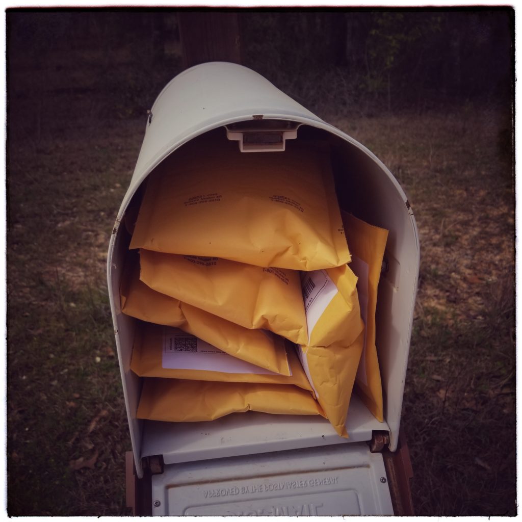 March Meet the Maker Day 12: Postage and Packaging. Ironic, since a week ago today was the first time I’ve had mail stolen out of my mailbox; stuff I’d ordered (for swag for yarn club, sigh, *and* it was handmade), not stuff I was mailing out. So all this week I’ve been a little wary about my mailbox, which I do use as often as I can for mailing out packages. If I can fit it in the mailbox, I will! That saves me from having to drive to the post office – which, granted, is not that far away… but sometimes you just don’t want to start up the car and go somewhere, am I right?! Anyway. The little post office closest to my house is open M-F, 11-3, which is mostly when I mail things if I can’t fit it in my mailbox (the occasional rare Saturday shipment has to be able to fit in my mailbox, which means very rarely are things mailed out on Saturday). As far as packing material goes, I will reuse packing peanuts and quality bubble-wrap, but I tend to not reuse boxes as by the time they get to me they’re usually beat-up. I tend to order from places that either already reuse boxes or their boxes get pretty beat up by FedEx or UPS, so… new boxes! Packed with love!