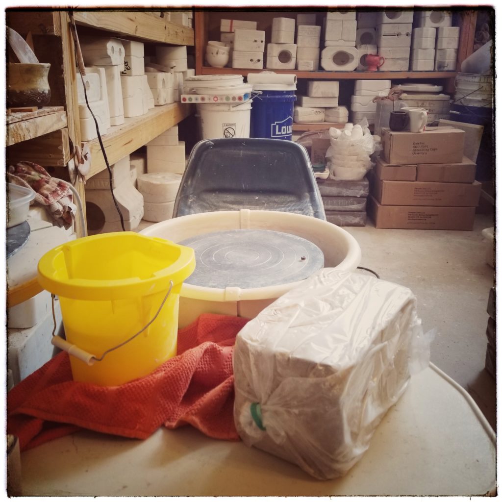 March Meet the Maker Day 20: Tools and Materials. Hopefully I’m getting all four photos I took uploaded here correctly! I couldn’t pick just one set of tools or materials to talk about, so here’s a little bit of everything. In ceramics (Picture 1), my trusty Pacifica, some Laguna B-mix, and in back, many of my grandmother’s plaster molds for slipcasting. Representing the yarn (Picture 2), here are all the dyes I use. You’ll wish the soap fragrances (Picture 3) were in smell-o-vision because boy howdy do they make my studio smell divine! And last but not least, my latest craft endeavor (Picture 4) is of my anvil, forge, and in the background close to the large kiln you can see my post vice and tools.