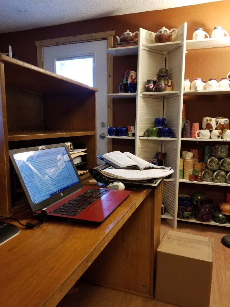 …. view from a desk! Look, a rare moment with no cats on my new cat shelf! I didn’t mean to install a cat shelf, mind you… I *meant* to install a shelf on which to put the different paper and labels I need for printing. But the cats had other ideas. Sigh.