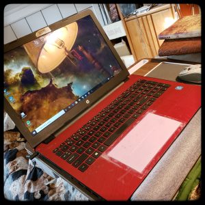 On the down side, Scrivener is on my laptop, with the Track Pad of Doom. Although taping the index card has helped. I mean, it doesn’t block touching, really… but it does give me a visual and I’m learning to type with my wrists in the air over it (the trackpad is red, same as the laptop, so I often forget that it’s there).