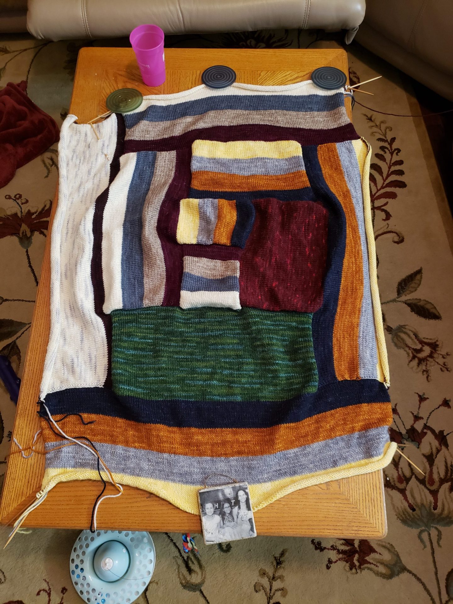 Let’s see… hours of laughing with the girls? Accomplished. Cats? Petted. Dogs? Ignored (their dog, which used to be Heath’s dog, is afraid of me. I’m not sure why, it makes me sad, but I try to tell her every time I see her that she is the Best Pupper, and other than that just… hope she one day comes around.) New computer? Bought, and almost everything transferred over. Salads? Made and devoured. Tater tot casseroles? One in the oven as I type this, another one made and devoured a couple of days ago. Writing? About 3000 words, and another few thousand itching to get out. Accounting? Uh, nope, not touched, gonna have a lot of evening work ahead of me when I get home, to get all this done by the end of February. TV watched? Yep. Tried Bridgerton… nope. Tried a series on Netflix called You, it was amazeballs. Watched the new Disney movie, Soul, it was sweet. Knitting? Got some done! Finished the color stripe I was on, which took care of that block, and picked up stitches on the next side… I’m on the second color block of it, and I’m not sure but I think it’s 192 stitches at this point….? Color blocks are def taking longer now.