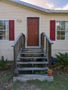 This was the part that I was just kind of like “whatever” on, but after it was done, y’all. I fucking love this the best! Holy crap! It’s amazing, and the pictures don’t even do it justice. And it’s not even complete yet. There will be a roof over the stairs, because I am so, so tired of struggling with the door in the rain as I’m juggling groceries. And yes, there will be a handrail up there – it just has to wait until we have the posts that will hold up the roof, to attach them to. No, there will not be another ledge or stairs. If you look closely (although I don’t know if WordPress will allow you to zoom in) it’s only about two inches, tops, lower than it originally was. That’s fine to step over. We do not in any circumstances want anything that’s going to block the bottom of the frame of the door – mobile home doors are not like, well, “real” doors. In order to get that frame off, if anything needs to be done to it, you have to be able to get to the screws which are flush underneath that white trim under the door. So covering that up means that you have to take off whatever is covering it in order to get underneath it. Trust us. We had to do that with the door in the back, take part of the deck apart to replace it, and y’all. That is NOT going to happen again.