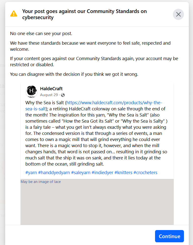 Well obviously I appealed it. Because my post wasn’t doing any of those three things. They denied my appeal, within minutes. I appealed it again. It was allegedly going to be looked at by a human, and I would be gotten back with in four business days. That was… fuck, July? August? Meanwhile, my OG profile (Lorena, instead of Lore) is in danger of being restricted, or even disabled, if I go against their Community Standards again. How do I know if I’ll do that, if I didn’t think I was doing that in the first place? Good thing, I guess, that I have that second account, because before I started the Lore account, if I lost access to the Lorena account, I’d also lose access to my HaldeCraft account… making all of this trying to sell on Facebook and Instagram a Moot Point.