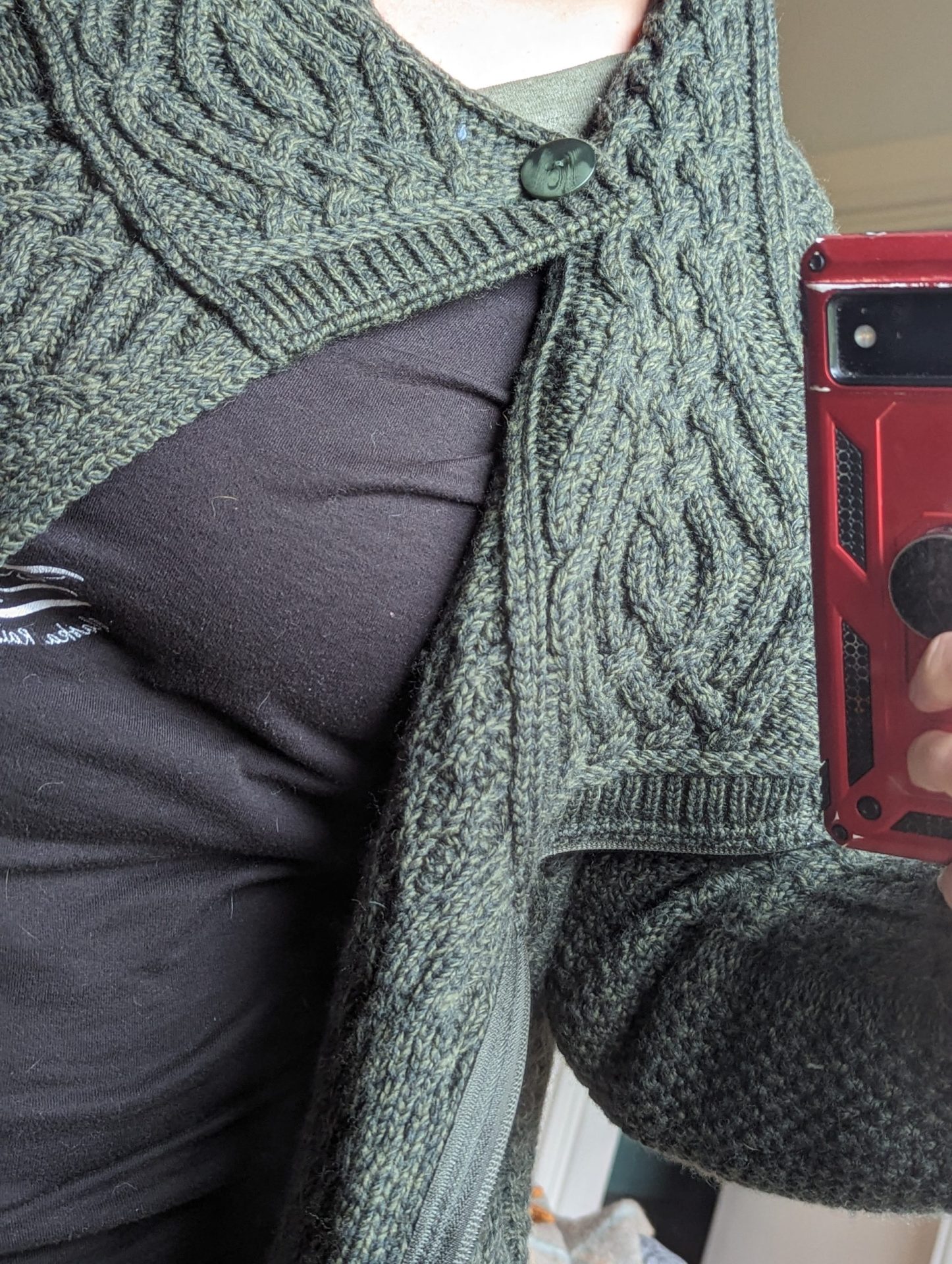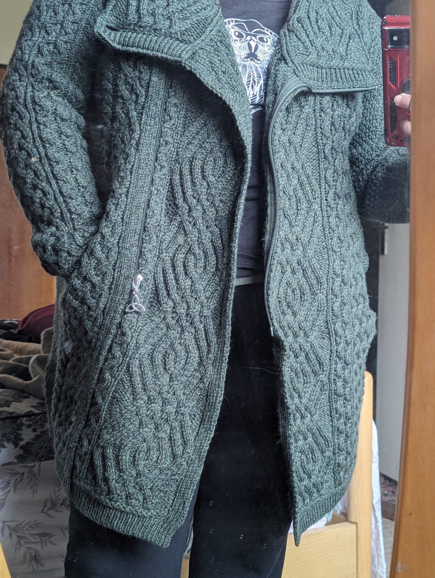 I’m ridiculously happy with this sweater, y’all. It’s in a color I would have used. It’s with some of my favorite cables. It’s asymmetrical which I never thought I would like but because it’s the zipper and not the hem, I love it. It’s got a lovely charm for a zipper pull, and I adore trinity knots. It’s ridiculously cozy. It zips up so high that I don’t need a scarf for a lot (although I did buy a scarf I really wanted in the Christ Church gift shop, did I show that off yet?). When Jenn and I take those outdoor tours out of Galway in a couple of days, and I wear my hat, scarf, and this coat, I’m going to be SO WARM. You know, I wasn’t cold when I bought it – I was smart, wearing layers, a hat, fingerless gloves, I was fine. But I also didn’t want to carry this in a bag when I still had two parks to go to, so I opted to wear it out thinking I’d rather be too warm than carrying too much. But I put it on and it felt like home.
