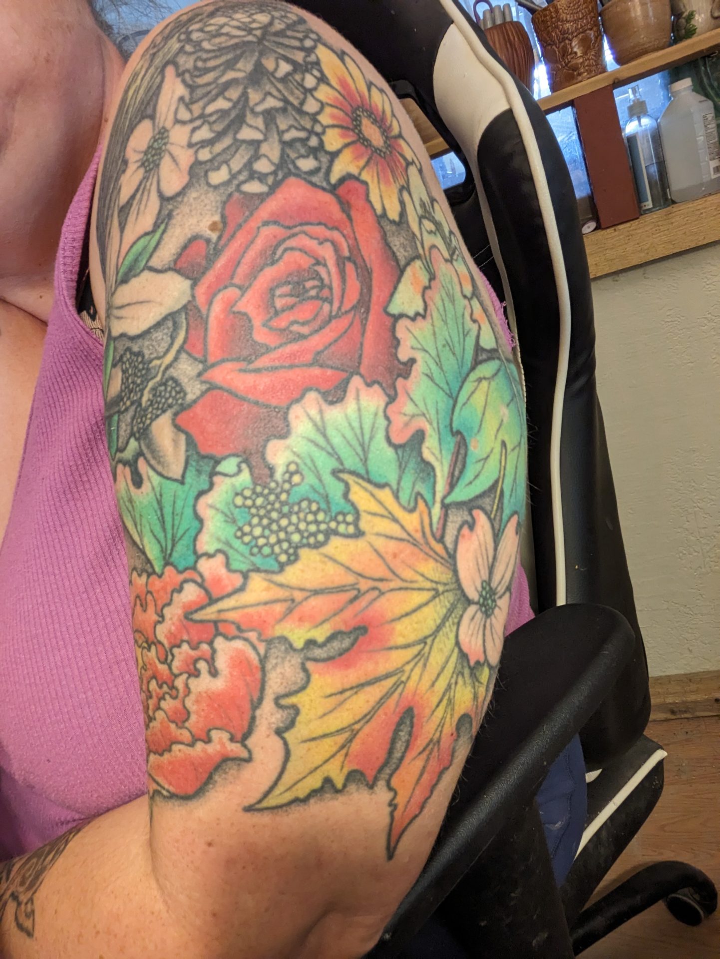 Lots of them, but many of them have since shuffled off this mortal coil, and I don’t really feel like talking about that right now – I woke up at 2AM this morning unable to go back to sleep and so I am tired and cranky and have a bit of a headache (is the weather changing?) and I don’t feel like really digging into that right now. It’s enough to say that many of them are in this tattoo, in the form of state trees or state flowers from where they were born. This way I carry them with me, everywhere, all times.
