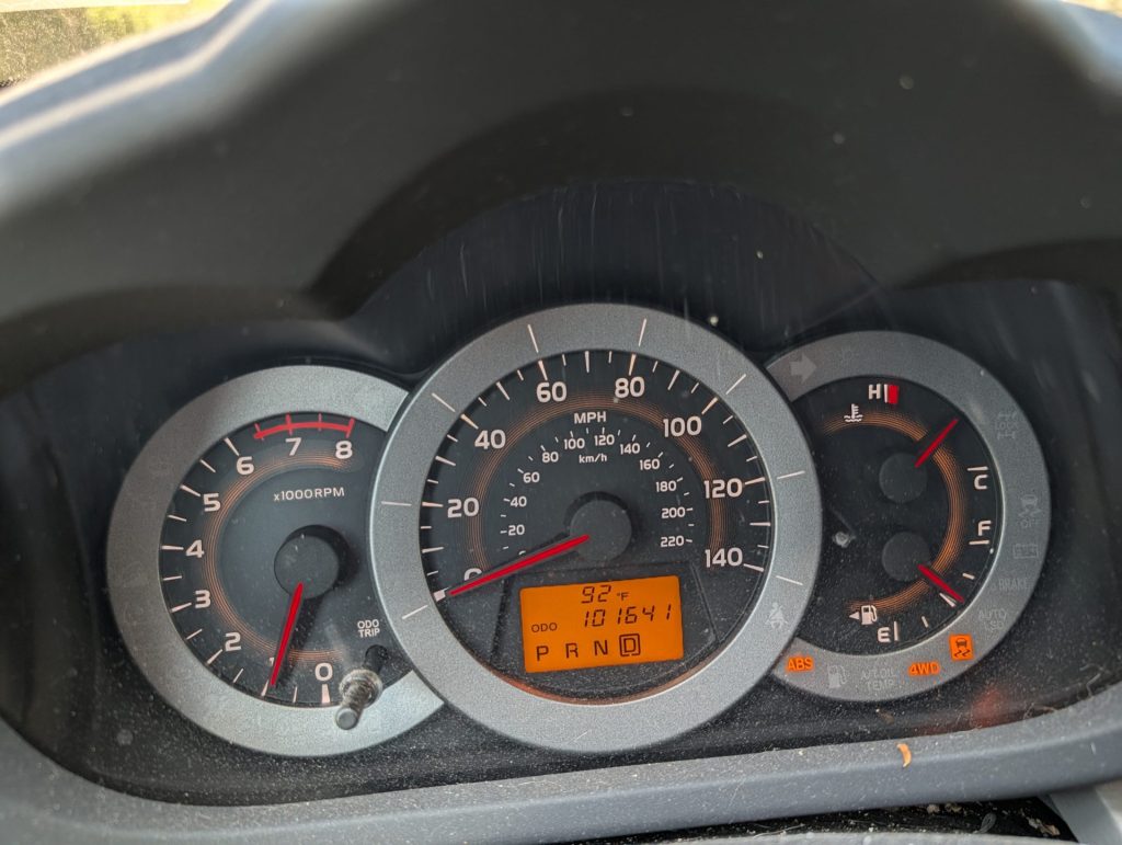 In January, on the 1st, as I was driving to my aunt and uncle’s for New Year’s Day, my car went haywire. The ABS/4WD/and whatever that light that looks like the car is skidding all over the road came on. The tire pressure light came on, and all three gauges were up and down and all over the place with no relation to whether the car was going or not. My car place kept the car for about five days (holidays and weekends dragged it out) and they couldn’t find anything wrong with it. I got it back, and things have been uneventful…. until yesterday.